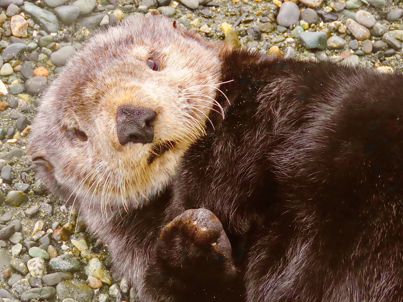 Sea Otters live ten to fifteen years or more and most spend the entirety of their lives at sea; only rarely do they haul out onto land. They even give birth in the water! Their ability to thrive in cold sea environments is due to unique evolutionary adaptations, primarily focusing on advanced thermoregulation. They are the only “marine mammals” that rely exclusively on dense fur and an extremely high metabolic rate to maintain a core body temperature of approximately 37.8°C. They also have two and a half to three times the lung capacity and oversized kidneys of similarly sized mammals. Likewise, webbed feet, armpit pockets for rocks, and whisker sensitivity that can detect food are also features adapted to a life at sea. Neat eh!